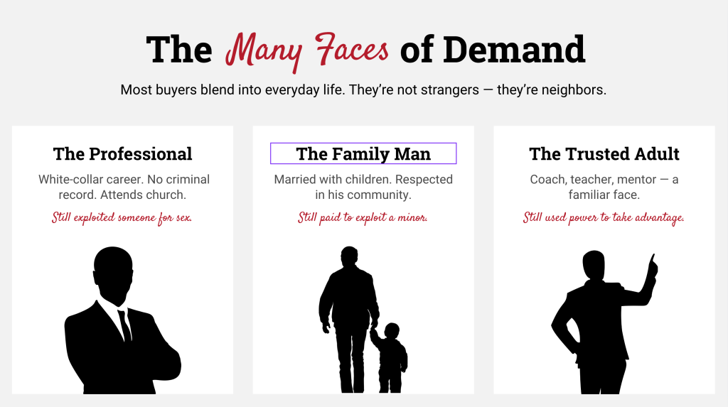 According to the National Human Trafficking Hotline, most buyers have no prior record and blend into everyday life. They aren’t lurking in back alleys — they’re attending meetings, watching sports, and scrolling online platforms for their next encounter.