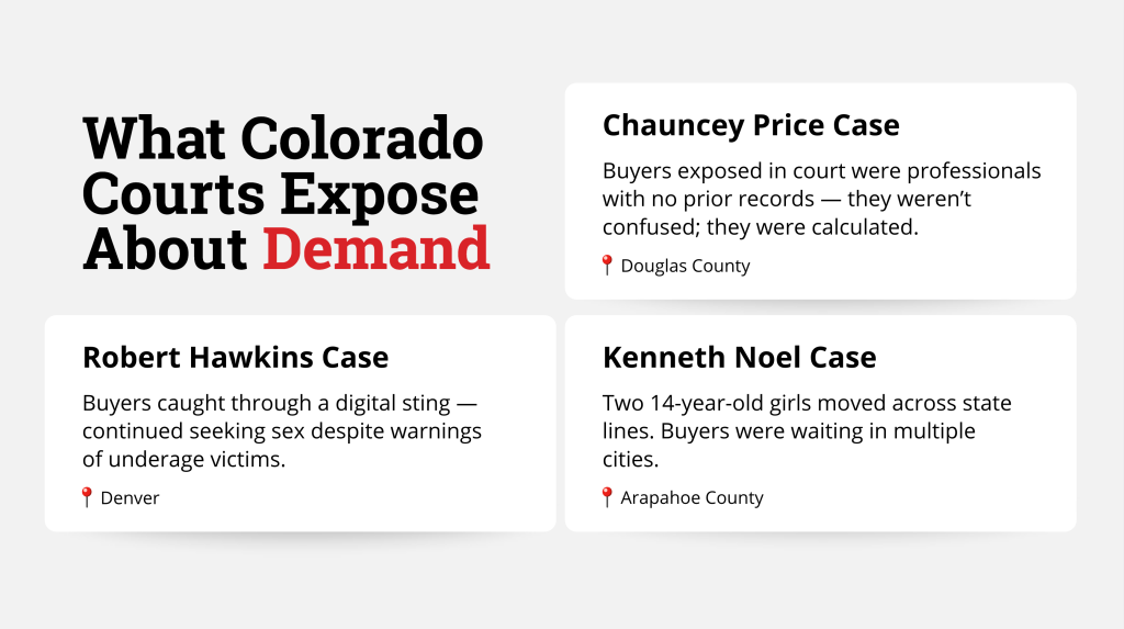 In recent years, sex trafficking trials in Colorado and across the country have revealed what really fuels this system: demand. It’s not desperation, it’s not always organized crime — it’s demand. Courtroom evidence shows that the demand for trafficking is driven by everyday people — husbands, fathers, professionals — who may appear “respectable” on the outside but are fueling a devastating underground market.